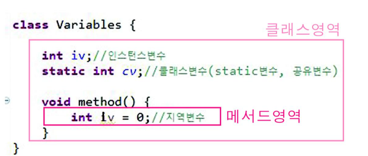 | 클래스영역(클래스 시작부터 끝까지: 선언문만 가능 | 인스턴스변수 (instance valiable: iv) |