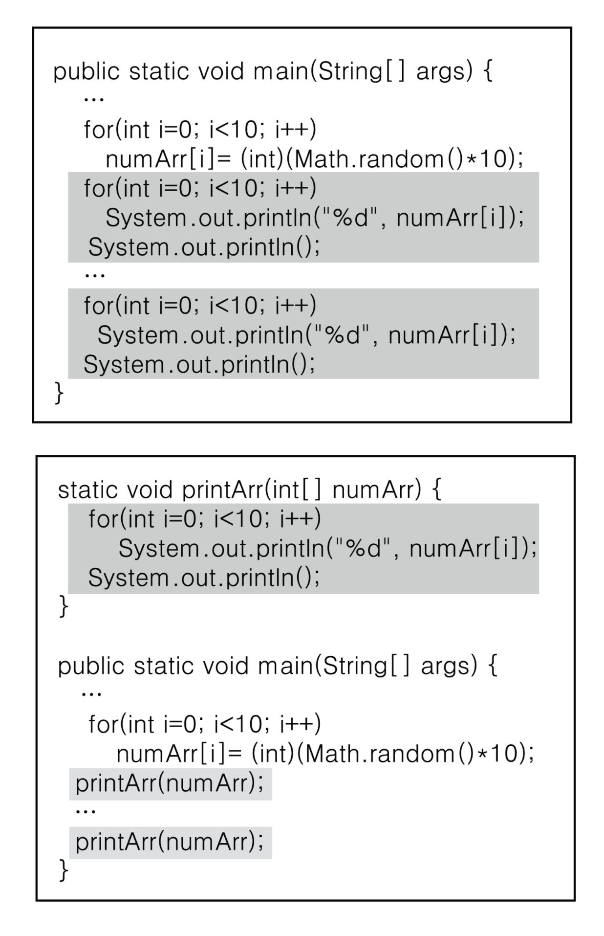위 그림에서 위쪽 코드는 메서드를 필요할 때마다 매번 호출합니다.