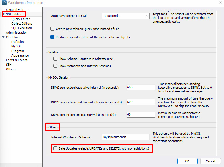 Edit - Preferences - SQL Editor - Other에서 Safe Update 체크를 해제하고 다시 workbench 켜기