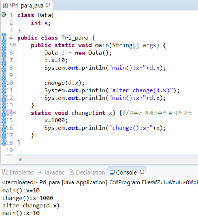 기본형 매개변수: 변수의 값을 읽기만 할 수 있다. (read)
