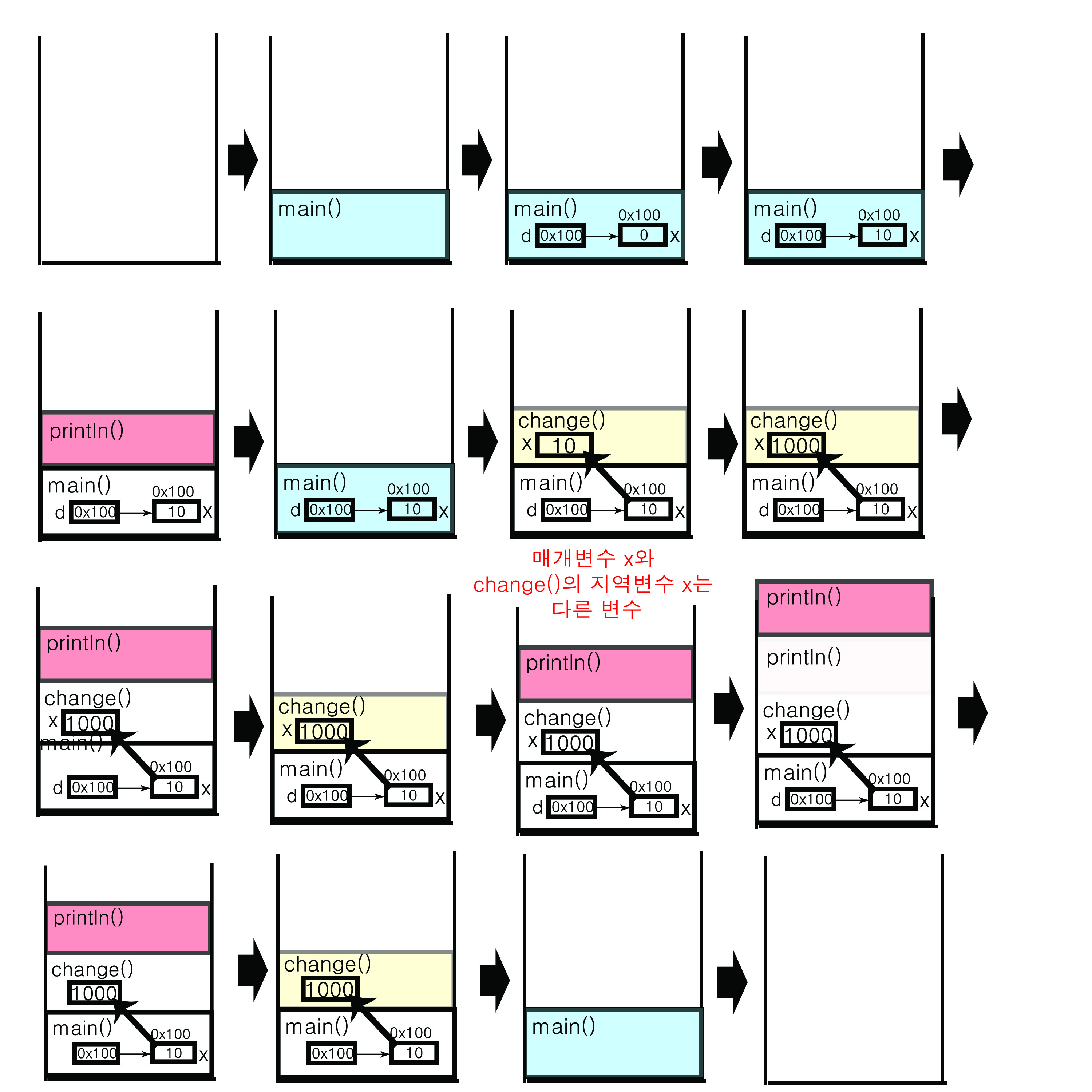 지역변수 x의 값이 바뀌어도 매개변수 x의 값은 따라 바뀌지 않습니다.